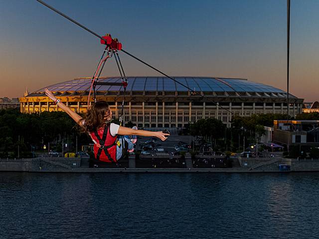 Полет на зиплайне происходит через Москву-реку и Лужнецкой набережной, заканчивается на крыше нижней станции московской канатной дороги «Лужники». Во время спуска открываются просто незабываемые виды на город, Нескучный сад, небоскребы делового центра Moscow City.